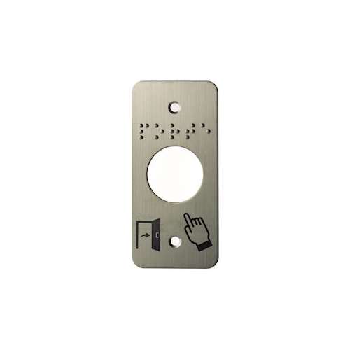 Bouton poussoir PMR acier inoxydable - Accessoires, SSP125 - Caractéristiques : •Matériel : Acier inoxydable •Marquage plaque : Pictogrammes "Porte & doigt" et "PORTE" en braille •Perçage plaque : Diamètre 25 mm •Dimensions (L x h x p) : 39,5 x 84,5 x 1 mm •Poids brut / Poids net : 0,028 Kg / 0,027 Kg •Conditionnement par : 1 ou 50 ou 100 •Code douane : 8302411000 •Code EAN 13 : 3760273116774