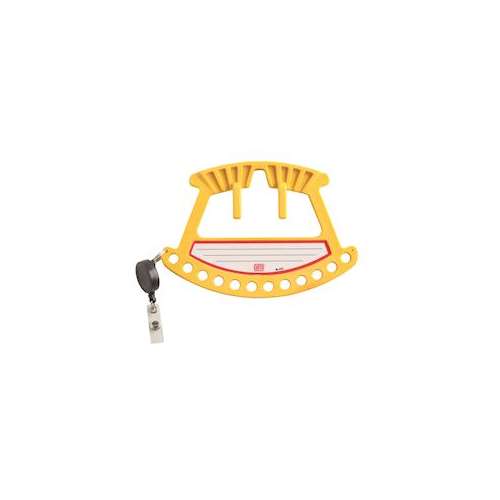 Poignée porte-cadenas en PVC jaune, avec porte -clés intégré. Peut se mettre à la ceinture. Dimensions : L : 190 mm x H 130 mm. Accepte jusqu'à 12 cadenas. Diamètre des trous : 9 mm. Etiquettes d'identification sur les deux faces.