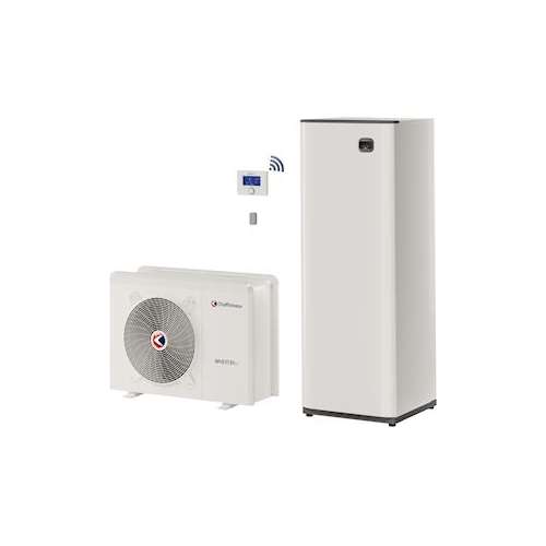 Solution la plus compacte du marché, Arianext Compact M réunit une pompe à chaleur monobloc Inverter réversible et une colonne tout-en-un intégrant un module hydraulique et un ballon de stockage de 180 litres pour l'eau chaude sanitaire.