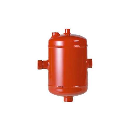 Pot de décantation pour installation de chauffage. Pose sur conduite horizontale. Corps en acier laqué rouge. Prises prévues pour pose d'un purgeur d'air, d'une vanne de chasse et d'un robinet de remplissage.