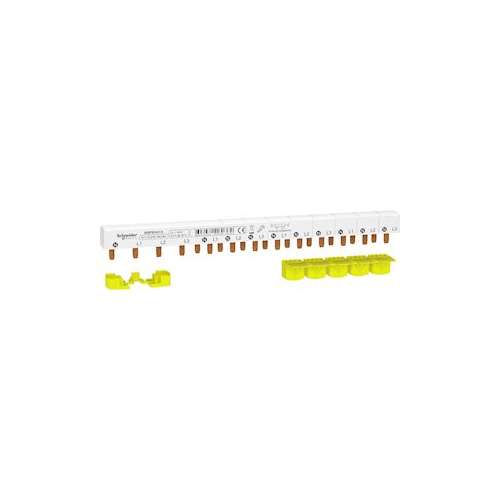 Offrez le meilleur à vos clients et choisissez le confort de l'appareillage peignable XP de la gamme Resi9 de Schneider Electric conçue en toute robustesse et sécurité. Solution de protection optimale, elle fait la promesse de satisfaire vos clients tout en valorisant votre professionnalisme. Peigne monobloc 3P+N Resi9 XP Schneider Electric, ce peigne de raccordement comporte 13 modules de 18 mm soit 26 pas de 9 mm. Découpable, il est vendu avec un cache dents de 5 modules recoupables. Accessoire de raccordement 1P+N facile à installer, ce peigne horizontal dispose d'un courant assigné d'emploi de 63 A et d'une tension assignée d'isolement de 250 V CA. Son emplacement de montage est supérieur, sur bornes type tunnel et son montage s'effectue à l'horizontale.