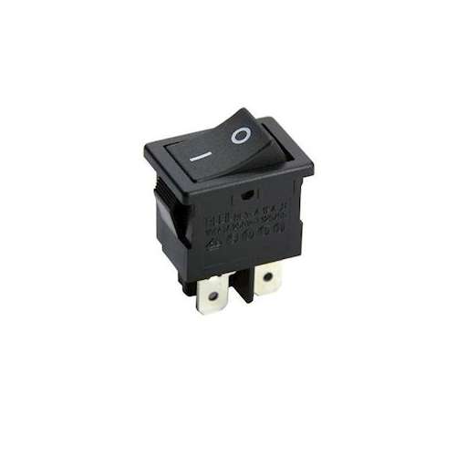 RL34-21-G-2-BK/BK-P8 : interrupteur ON-OFF bipolaire 6A/250V, pour découpe 19x13mm. Corps noir, touche noire avec marquage O/I blanc. Raccordement languettes 4,8mm.