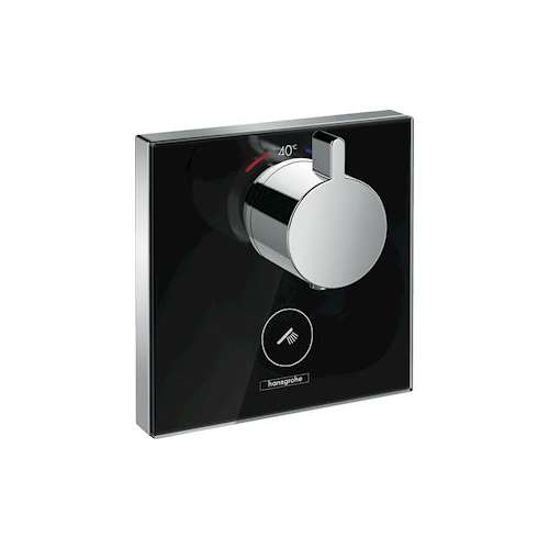 Set de finition en verre pour mitigeur thermostatique encastré haut débit avec une sortie permanente et un robinet d'arrêt noir/chromé