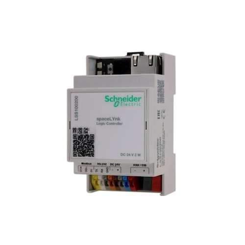 SpaceLYnk de Schneider Electric est le moyen le plus simple de créer une solution complète d'automatisation des bâtiments pour le secteur tertiaire. Solution complète d'automatisation du bâtiment pour petits et moyens bâtiments avec une architecture complète comprenant KNX, DALI Control), le comptage (offre Modbus, Smartlink RTU et IP) et la gestion des chaudières (SSL). Solution complète d'automatisation de bâtiment pour grands bâtiments avec une architecture complète gérée par BMS de Schneider Electric et KNX, DALI Control and Metering (offre Modbus, Smartlink RTU et IP). SpaceLYnk peut être utilisé de plusieurs manières: En tant que passerelle pour traduire et permettre la communication entre différents produits. En tant qu'agrégateur pour stocker, analyser et envoyer les données (fichier .csv par exemple). En tant qu'interface utilisateur pour afficher des informations pertinentes sur les appareils mobiles. En tant que contrôleur d'événements qui envoie des e-mails en cas de problèmes. Applications: fonctions logiques. Visualisation WEB SCADA pour PC et appareils tactiles. Passerelle cross-standard entre KNX et Modbus RTU/TCP. Serveur BACnet (500 points). Intégration avec des appareils tiers via RS-232 (IR, AV). Planification. Caméra en streaming. Enregistreur de données avec tendances. Modèles Modbus prédéfinis. Programmation en bloc facile. Jusqu'à 50 utilisateurs avec un identifiant et un mot de passe différents. Contrôleur spécifique d'application BACnet certifié BACnet (B-ASC). Nouvelles icônes. Tension d'alimentation: 24 V CC. Consommation électrique: 2 W. Indicateur LED 1: LED verte (charge CPU). Indicateur LED 2: LED verte (fonctionnement) ou LED rouge (réinitialisation). Interface: 1x KNX, 1x10BaseT / 100BaseTX, 1x RS-485 (avec résistances de polarisation 47 k Ohm, sans terminaison), 1x RS-232, 1x USB2.0, 1x bouton-poussoir de réinitialisation. Borne: bus KNX: borne de raccordement bus 2 x 0,8 mm. Alimentation: pince, 0,5 mm²-1,5 mm². Série: Pince, 0,5 mm²-1,5 mm². Fonctionnement: -5 ° C à + 45 ° C. Environnement: Peut être utilisé à des altitudes allant jusqu'à 2000 m au-dessus du niveau de la mer (MSL). Max. humidité: 93%, sans condensation. Dimensions: 90 x 52 x 58 mm (HxLxP). Largeur de l'appareil: 3 modules, env. 54 mm. Remarque: les visualisations peuvent être générées automatiquement pour les smartphones, tablettes et écrans tactiles à l'aide du logiciel EConfigure KNX Lite (LSS900100).