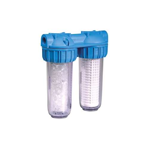 Station de filtration double STATION DUO-BX - Composée d'un double porte filtre, d'une cartouche filtrante FA10SX de 25µ et d'une cartouche HA10SX pour traitement anti-calcaire - Raccordements 3/4' F/F