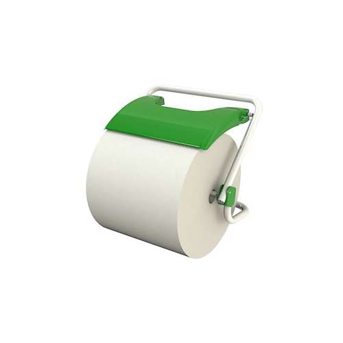 SUPPORT BOBINE mural, pour bobine industrielle avec une scie en plastique intégrée dans le couvercle. Structure tubulaire en métal avec une finition époxy blanc. Couvercle vert.