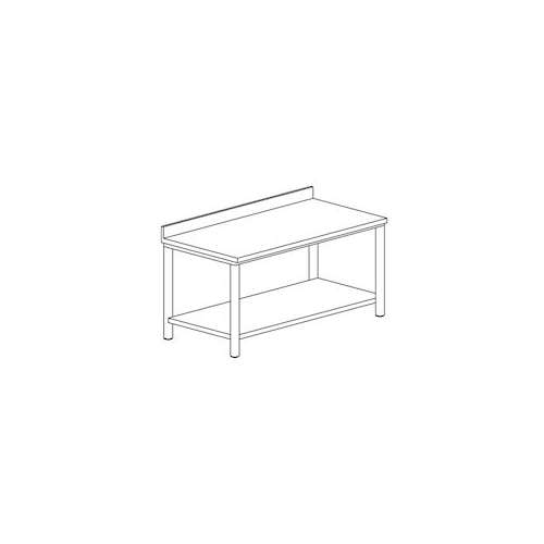 Table adossée avec décalage arrière et dessus renforcé et étagère basse. Livrée démontée. Bord tombé de 40 mm. Dosseret 100x20 mm. Traverses de renfort supérieures. Piétement rond ø 50 mm avec vérins réglables.